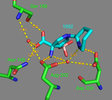 Analysis of compound 11 co-crystalized with hArg II confirms the hydrogen bonding interaction between the piperidine ring nitrogen and Aspartic acid residues. As illustrated in Figure 1, the piperidine nitrogen forms one hydrogen bond with Asp 200 (3.09 A) and one with Asp 202 through a water molecule (2.73 A).