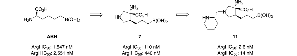 The increased potency relative to ABH arises from the added effects of two specific structural changes: introduction of a ring constraint that reduces entropy, and addition of a basic amine side chain that is positioned to form new ionic interactions with aspartic acid residues in the active site pocket. This new class of arginase inhibitors is significantly more potent than any series previously reported. It is hoped that these compounds will help facilitate a better understanding of arginase and the specific pharmacological role it plays so many important diseases.