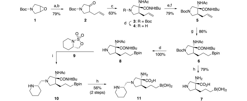 Reagents and conditions: (a) allyl magnesium bromide, ether, 0 oC; (b) pyridine-sulfurtrioxide, DMSO, diisopropylethylamine, DCM, 0 oC; (c) t-BuNC, NH4Ac, CF3CH2OH, RT, 3 days; (d) TFA, DCM; (e) (2S,3S)-2,3-bis(benzoyloxy)-4-(isopropylamino)-4-oxobutanoic acid, MeOH, IPA; (f) BOC2O, aq NaHCO3, EtOAC; (g) pinicolborane, Ir2Cl2(COD)2, dppe, THF; (h) 9N HCl, AcOH, 100 oC, 12 h; (i) ACN.